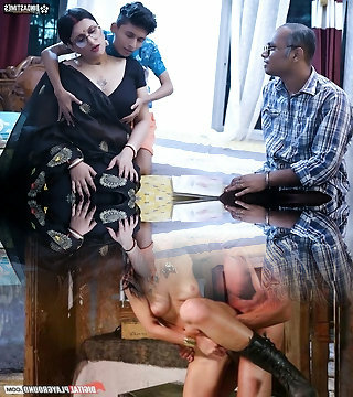 Tamil Cougar Stepmom Stuck Under Bed with white saree & ebony blouse, when she cleaning under couch then stepson fuck her