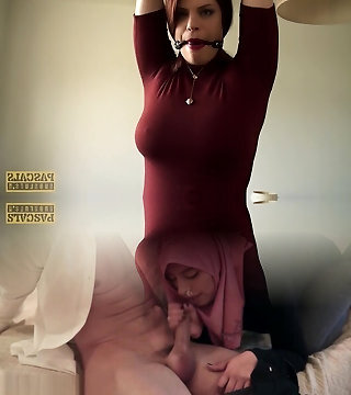 Chubby redhead lady is tied up in bed and draped