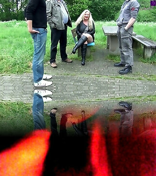 Cougar in pantyhose with natural breasts masturbates outdoors