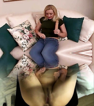 blonde schoenheit schiebt sich riesen fake penis in die muschi